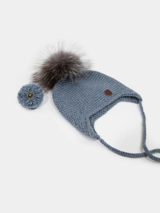 3 Merino Wool Beanie with Fur PomPom for Baby/Toddler or Kids (Blue)