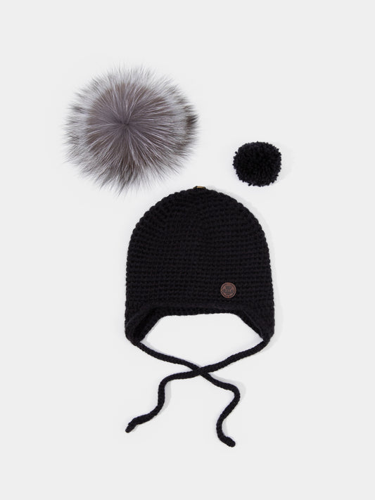 6.2 Chunky Knit Merino wool hat with silver fox fur or yarn PomPom (Black)