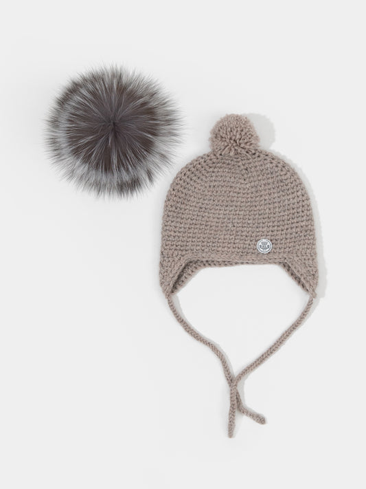 3.2 Merino Wool Beanie with Fur PomPom for Baby/Toddler or Kids (Beige)